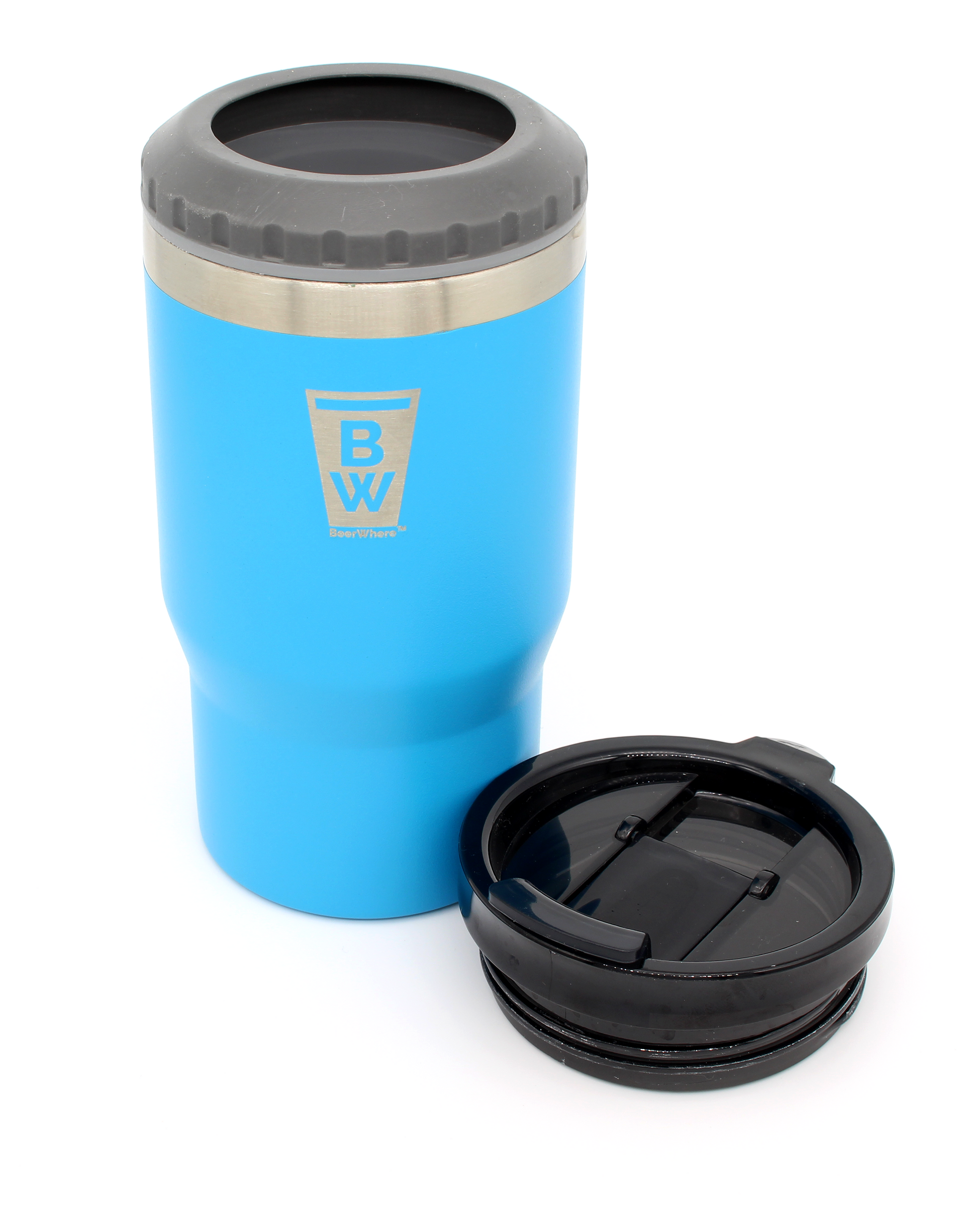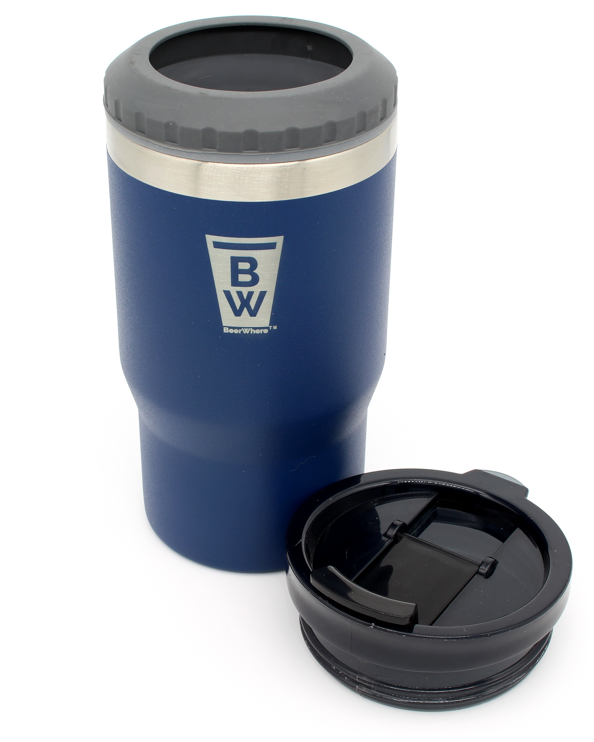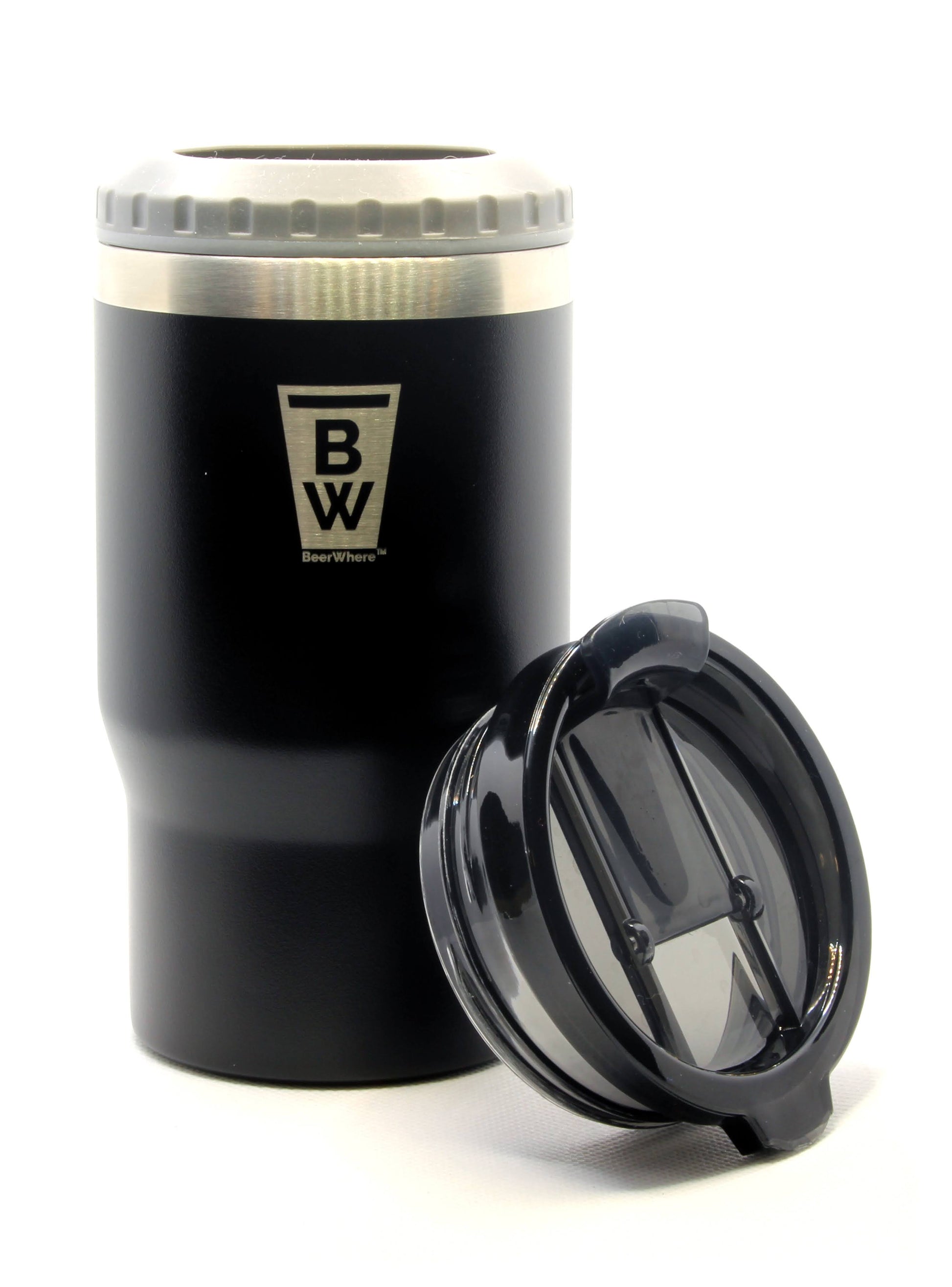 The BeerWhere Model 1200 is a 14 oz. 4-in-1 vacuum-insulated stainless steel can cooler and tumbler. The Model 1200 fits standard 12 oz. cans and bottles and 12 oz. slim cans. The 1200 can also be used as a 14 oz. tumbler and comes with a plastic screw-in travel lid with a stopper arm that locks open and closed. It holds 12 oz. with the lid in place.