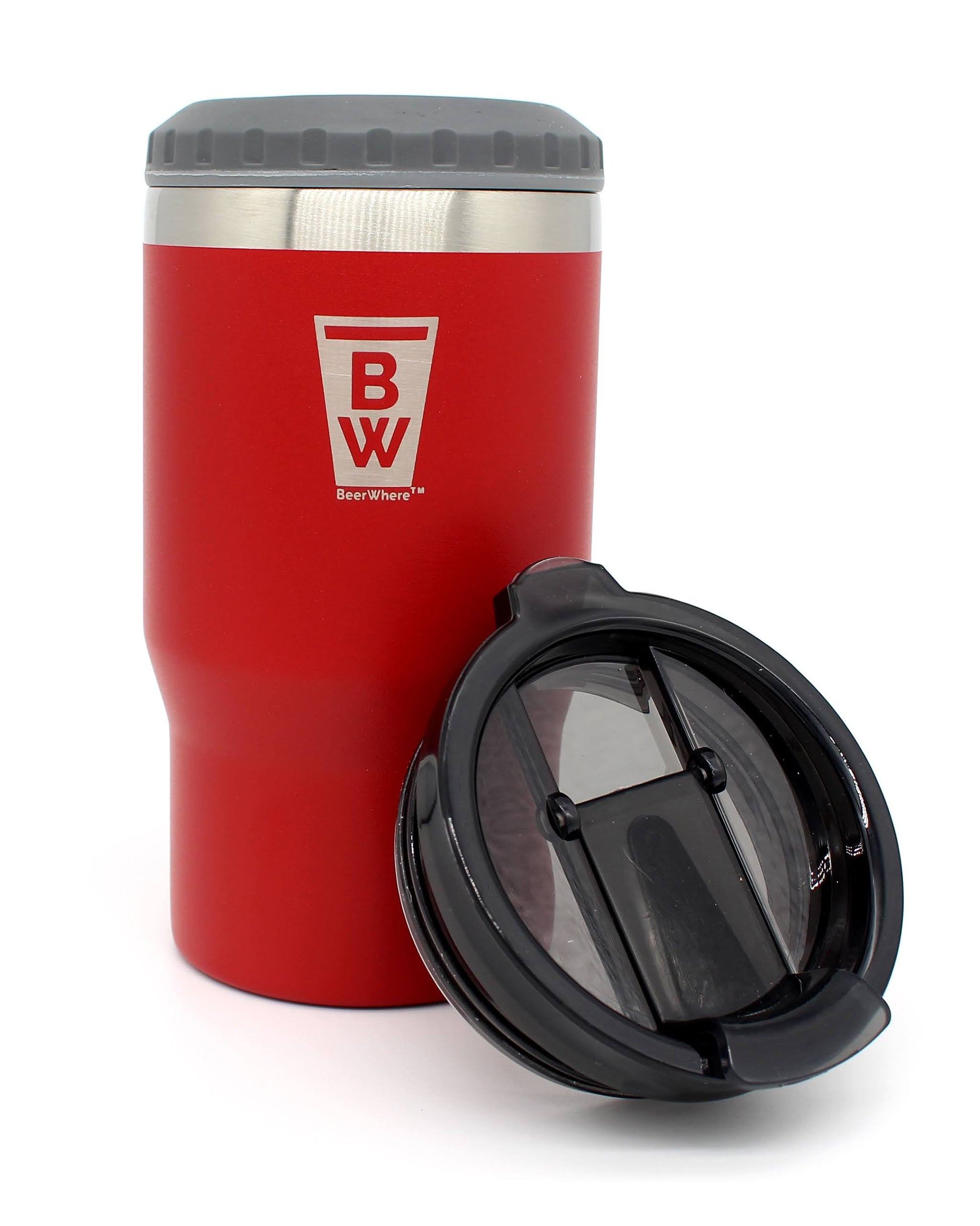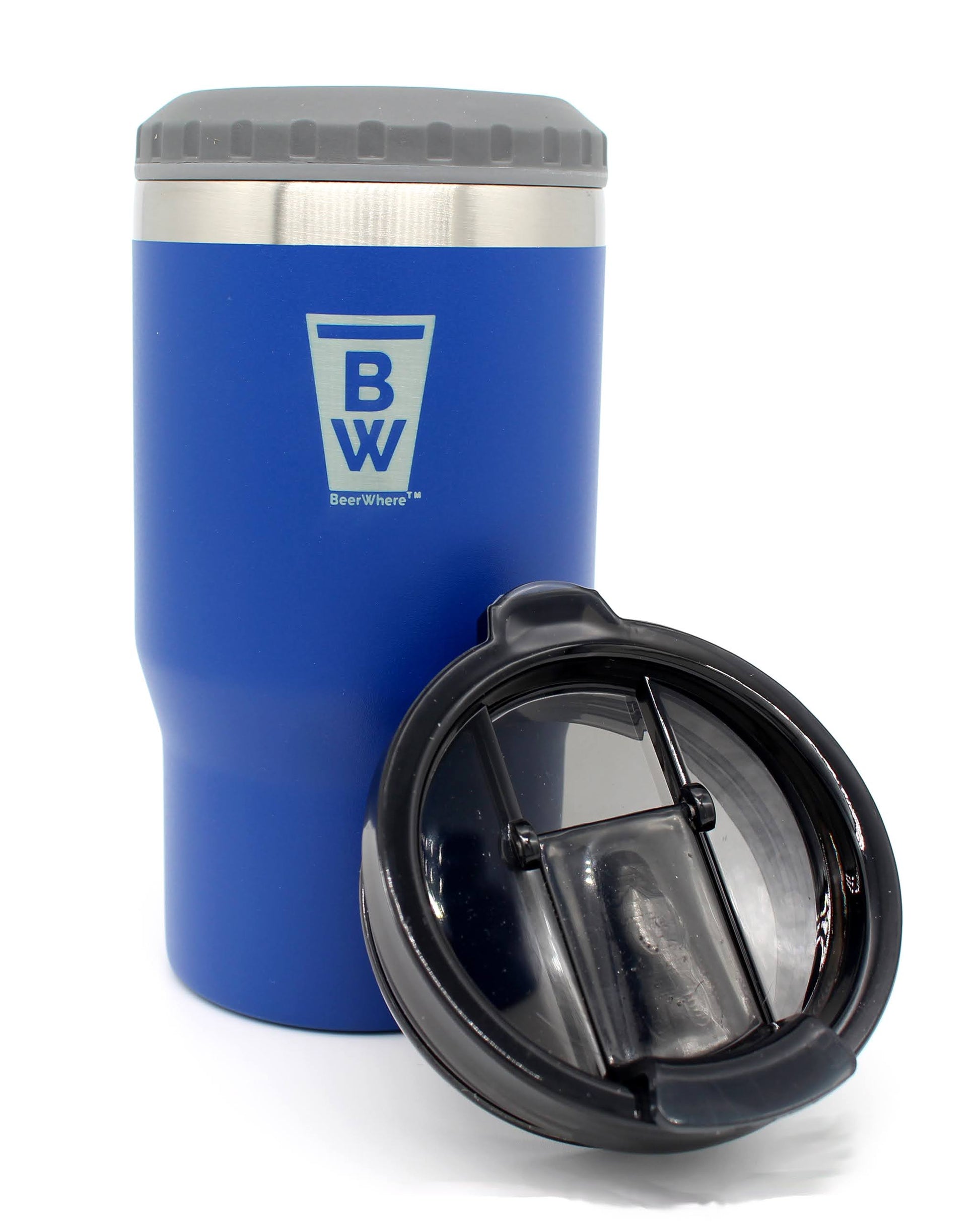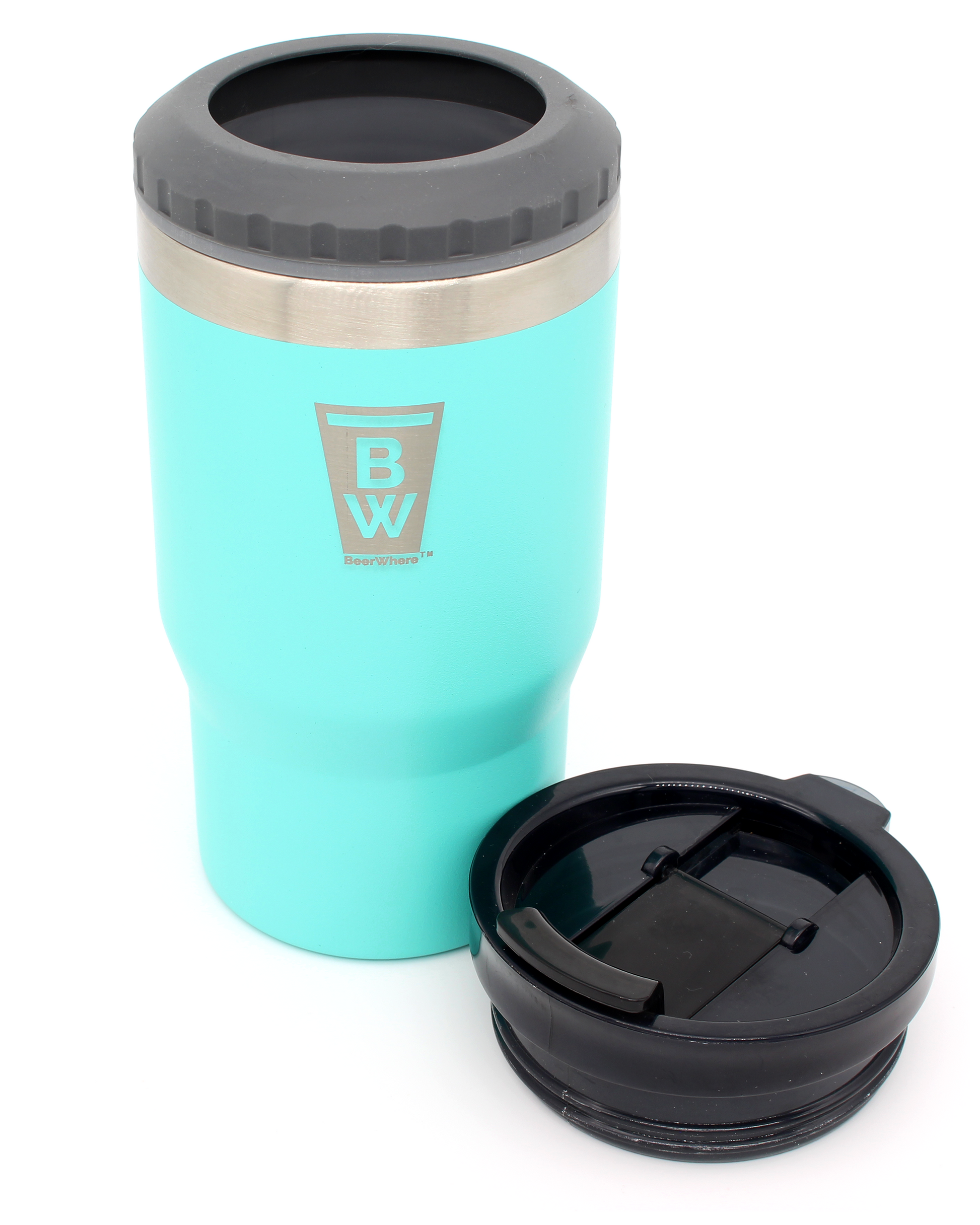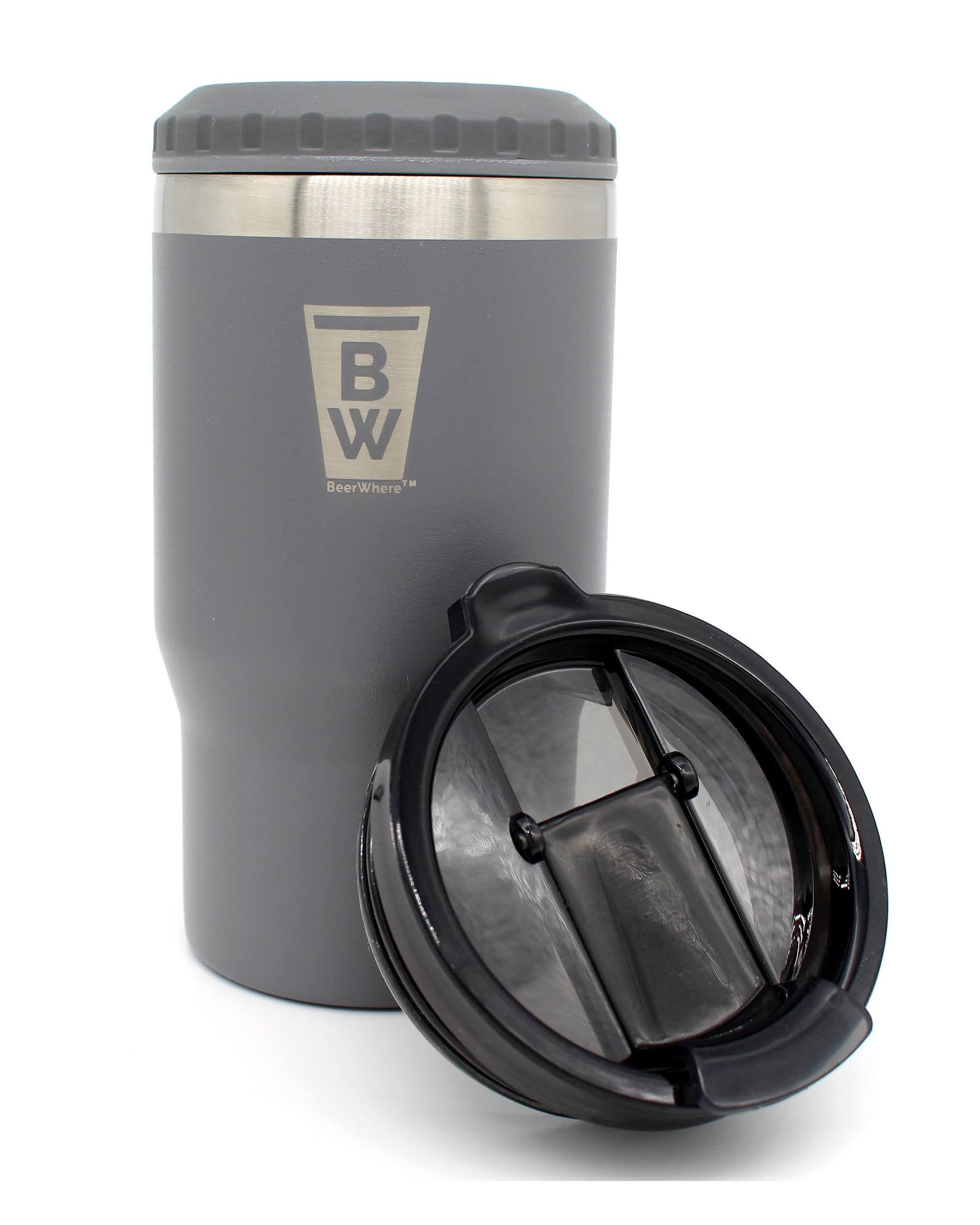 The BeerWhere Model 1200 is a 14 oz. 4-in-1 vacuum-insulated stainless steel can cooler and tumbler. The Model 1200 fits standard 12 oz. cans and bottles and 12 oz. slim cans. The 1200 can also be used as a 14 oz. tumbler and comes with a plastic screw-in travel lid with a stopper arm that locks open and closed. It holds 12 oz. with the lid in place.